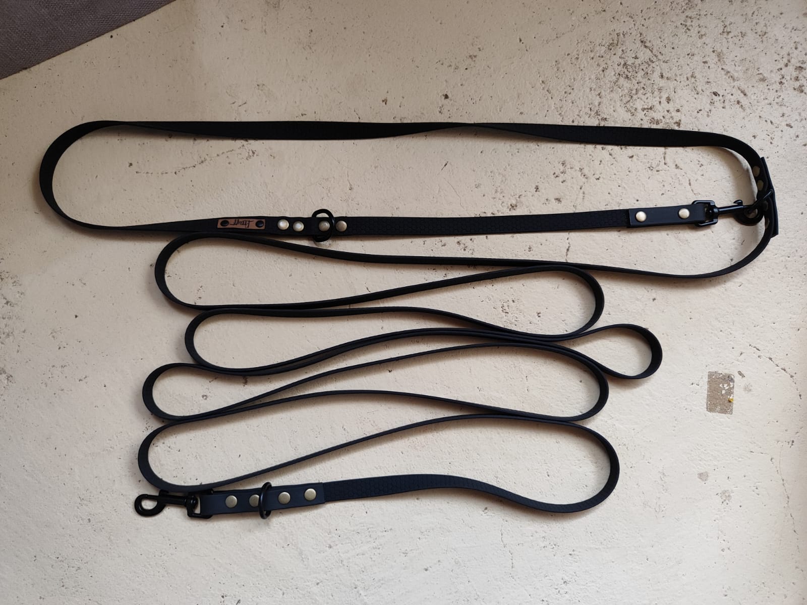 4 Utilizar cada mosqueton para un perrito (Largo quedaría mitad y mitad Ej: Correa de 3mt queda de 1.5 para cada perito)